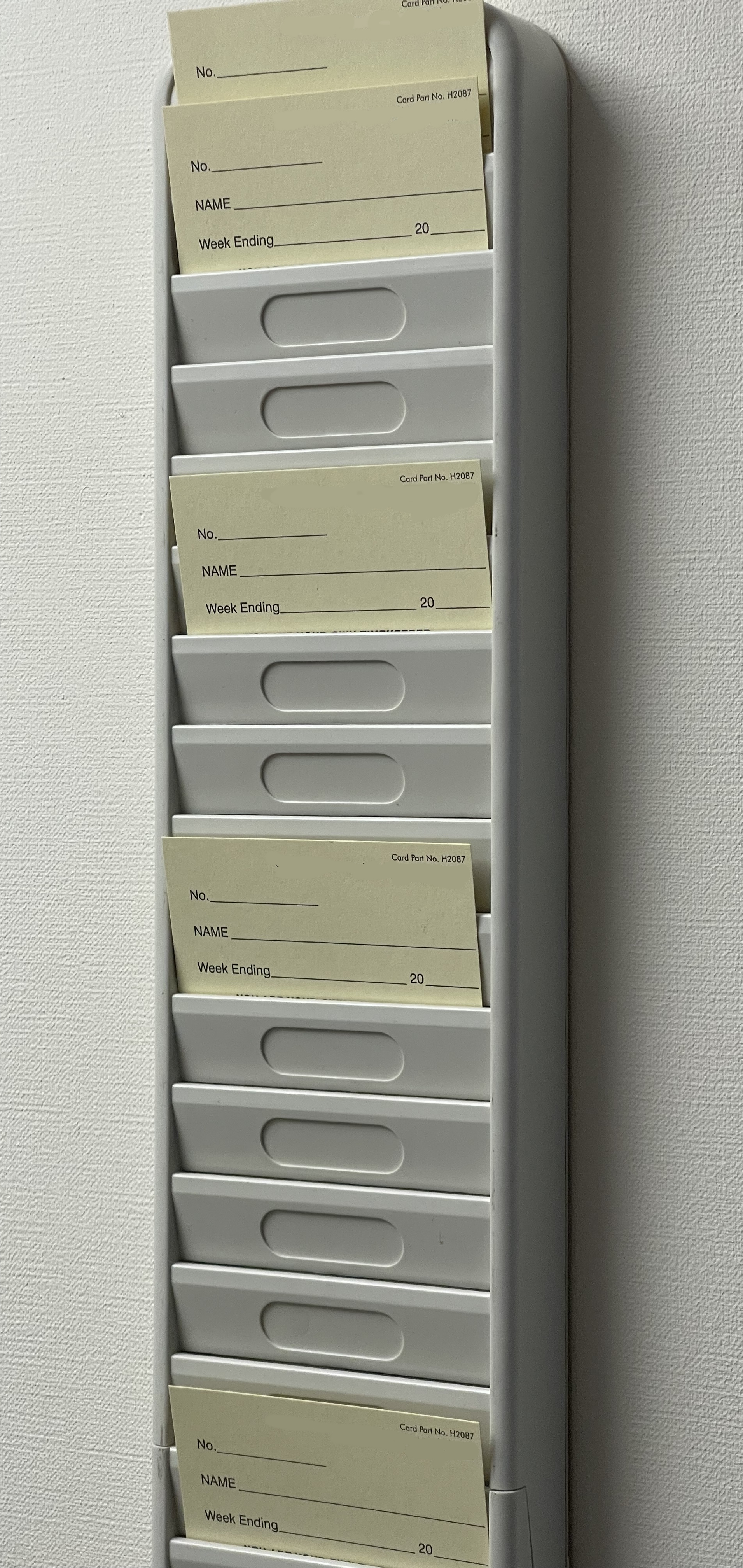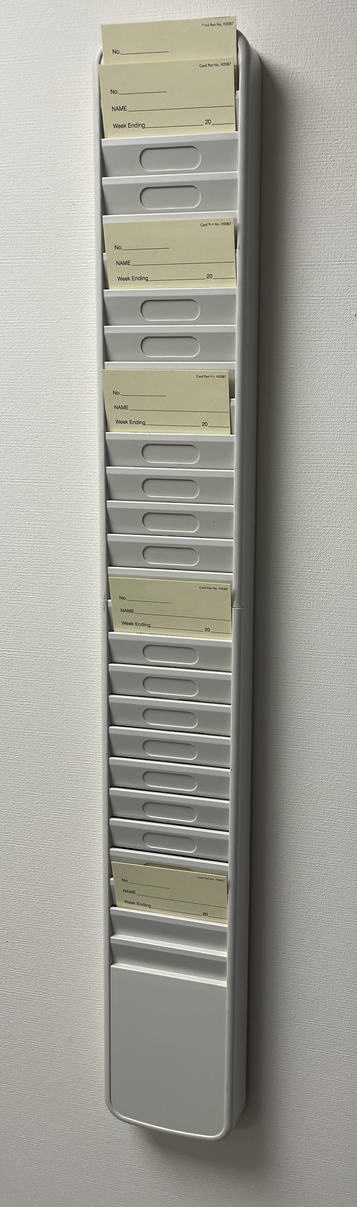 ABS Plastic Punch Card Rack in Light Grey with 25 Pockets. 2087/25E suits cards of length 140mm or more Pocket dimensions 90 Depth x 88mm Width.